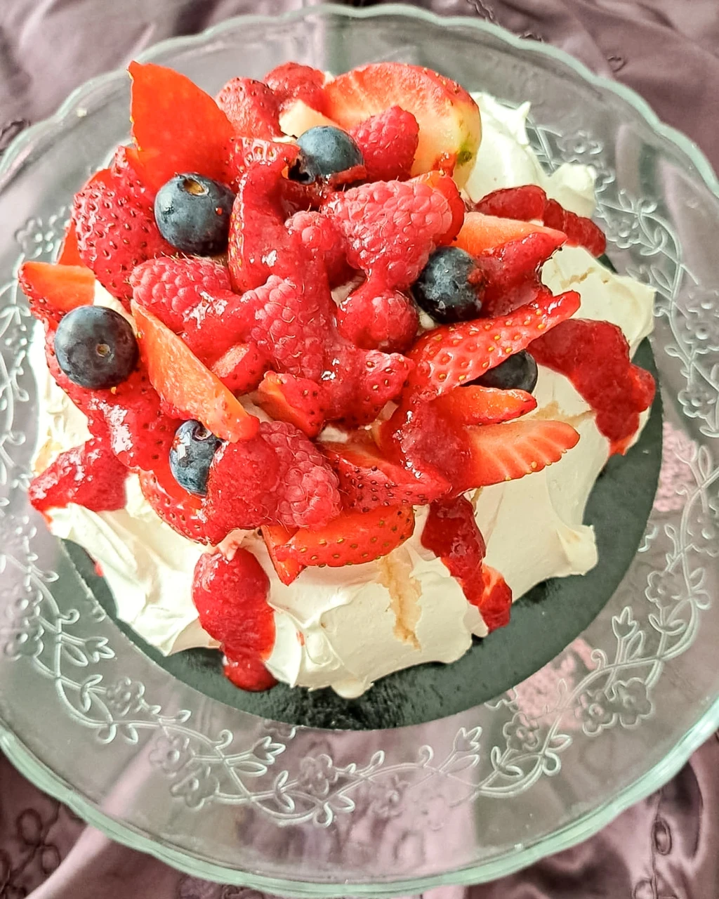 Õhuline ja õrn Pavlova, seest pehme ja väljast krõbe - sidrunikreemi ja maasika-toormoosiga, peal siidine vahukoore-toorjuustukreem ning kevadised marjad.